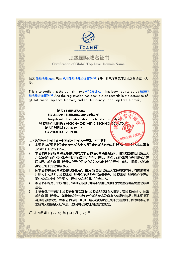 2018年4月16日,我所在阿里云成功注册“仲和法律.com"域名。